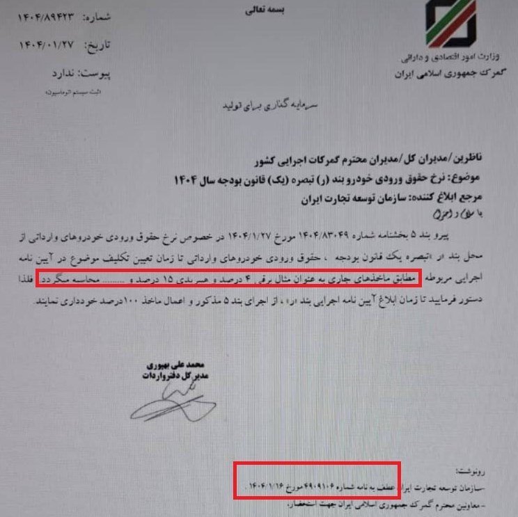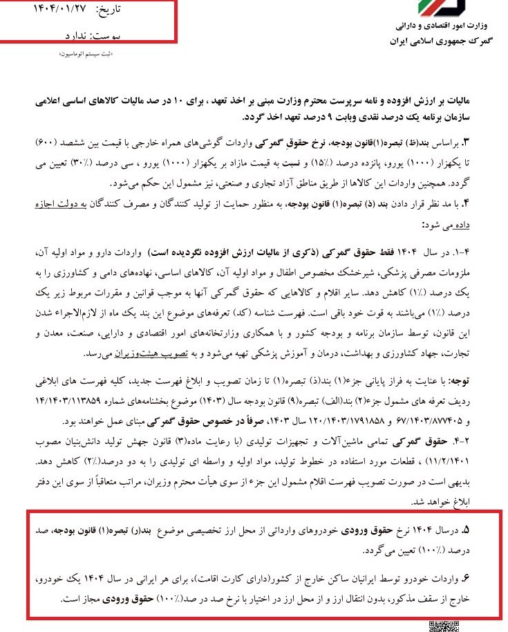 ابتدا بخشنامه زیر در تاریخ 27 فروردین ماه در خصوص احکام گمرکی بودجه 1404 و اعمال عوارض 100 درصدی واردات خودرو در سال جاری منتشر شده است.
