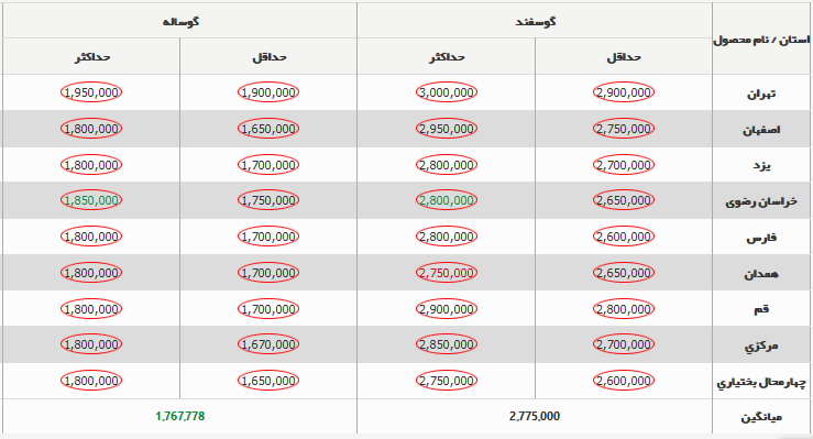 در استان خراسانرضوی قیمت هر کیلو گوسفند زنده بین ۲۷۰ تا ۲۸۰ هزار تومان و هر کیلو گوساله زنده ۱۷۰ تا ۱۸۰ هزار تومان اعلام شد. در استان فارس نیز قیمت هر کیلو گوسفند زنده ۲۶۰ تا ۲۸۰ هزار تومان و گوساله زنده ۱۷۰ تا ۱۸۰ هزار تومان است.