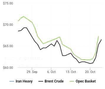به گزارش ايسنا، نفت برنت، روز جمعه، نزديك به ۶۶ دلار در هر بشكه معامله شد و حدود هفت درصد افزايش در هفته جاري نشان داد و نفت وست تگزاس اينترمديت امريكا حدود ۶۲ دلار در هر بشكه بود.