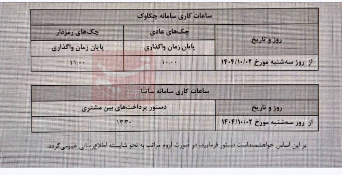 با ابلاغ بانک مرکزی از ۲ دی ماه ساعت کاری سامانه ساتنا تا ۱۳:۳۰ دقیقا هر روز خواهد بود.