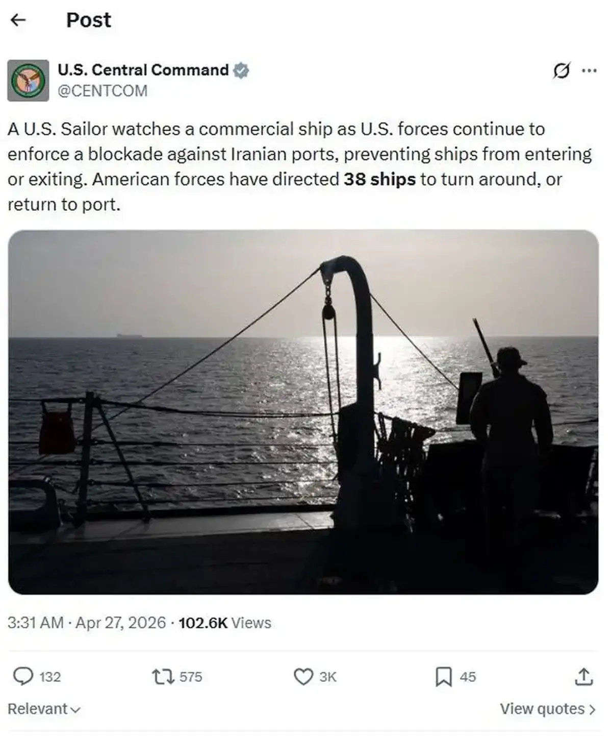 سنتکام با انتشار تصویر یک ملوان آمریکایی نوشت: «ملوان آمریکایی در حالی یک کشتی تجاری را زیر نظر دارد که نیروهای ایالات متحده همچنان به اجرای محاصره علیه بنادر ایران ادامه می‌دهند و از ورود یا خروج کشتی‌ها جلوگیری می‌کنند.»